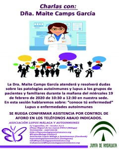 La primera será con la Dra. Maite Camps el miércoles 19 de Febrero de 10:30 a 12.30 en la que se proporcionará a pacientes y familiares herramientas e información para conocer el Lupus.